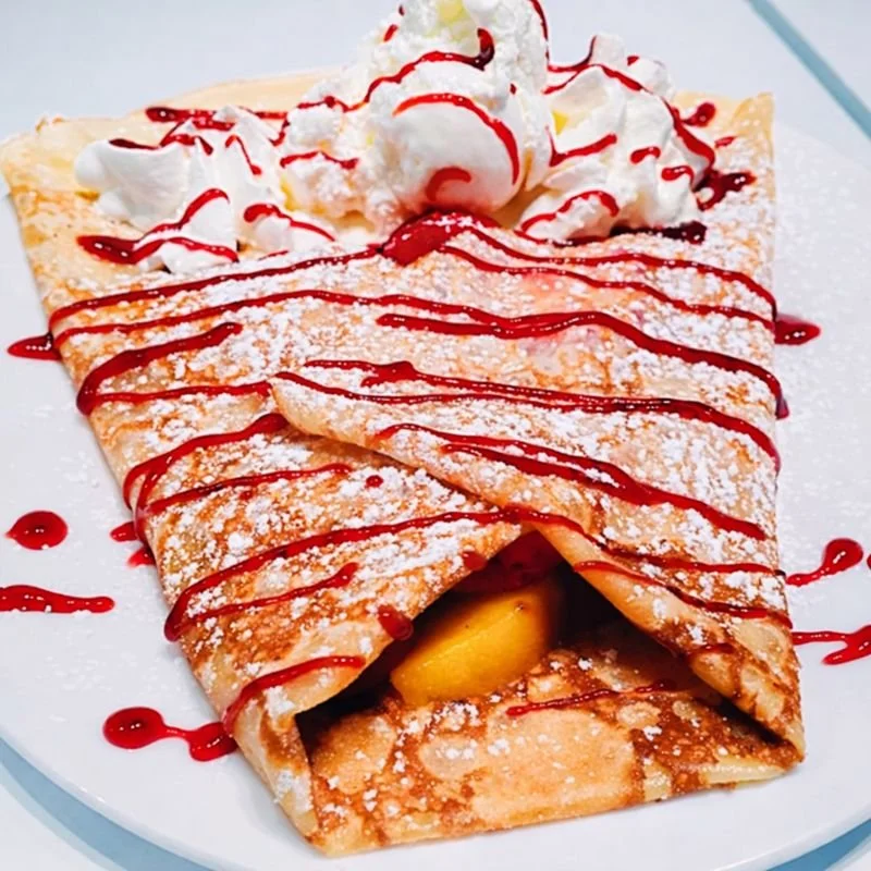 A dessert crepe on a white plate topped with whipped cream, vanilla ice cream, chocolate drizzle, and powdered sugar, with strawberries inside.